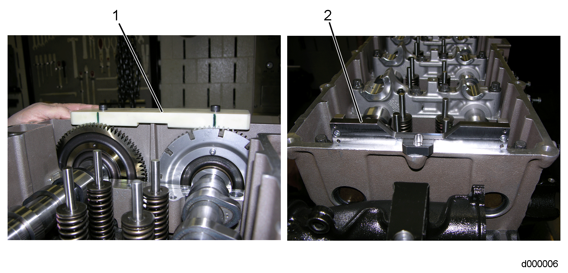 - Install the front timing tool (2) (W470589054000) into the grooves cut into the cams and pin it into the cam housing. Once it is in place, install a bolt into the tool to hold it in place.