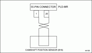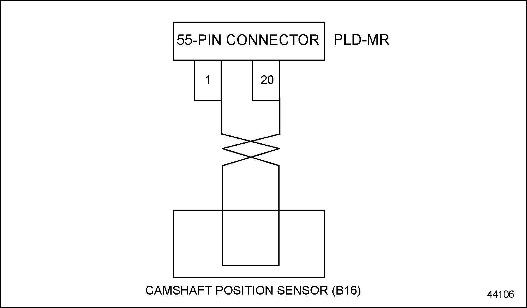 - Ensure that the camshaft position sensor wires are properly connected (not crossed) on the 55-pin connector. Repair as necessary. See Figure “PLD-MR — Camshaft Position Sensor Schematic” .